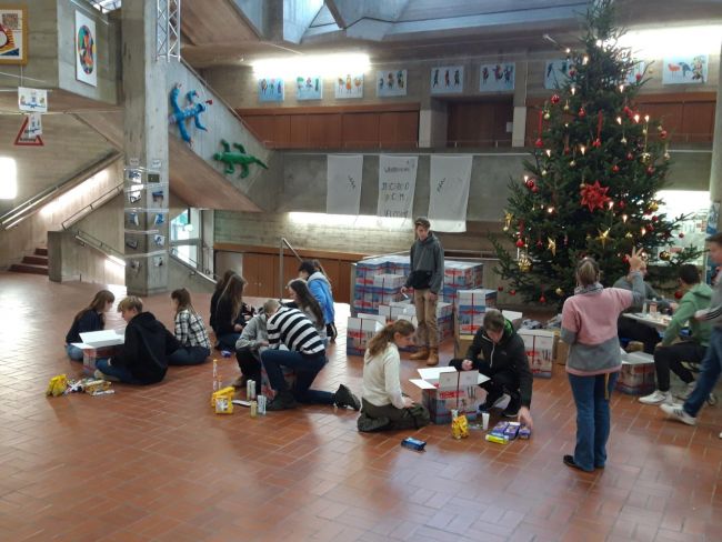 79 Pakete haben die Schülerinnen und Schüler aller Jahrgangsstufen zusammengestellt, um bedürftige Familien und Not leidende Kinder mit einem Weihnachtsgeschenk zu überraschen.
